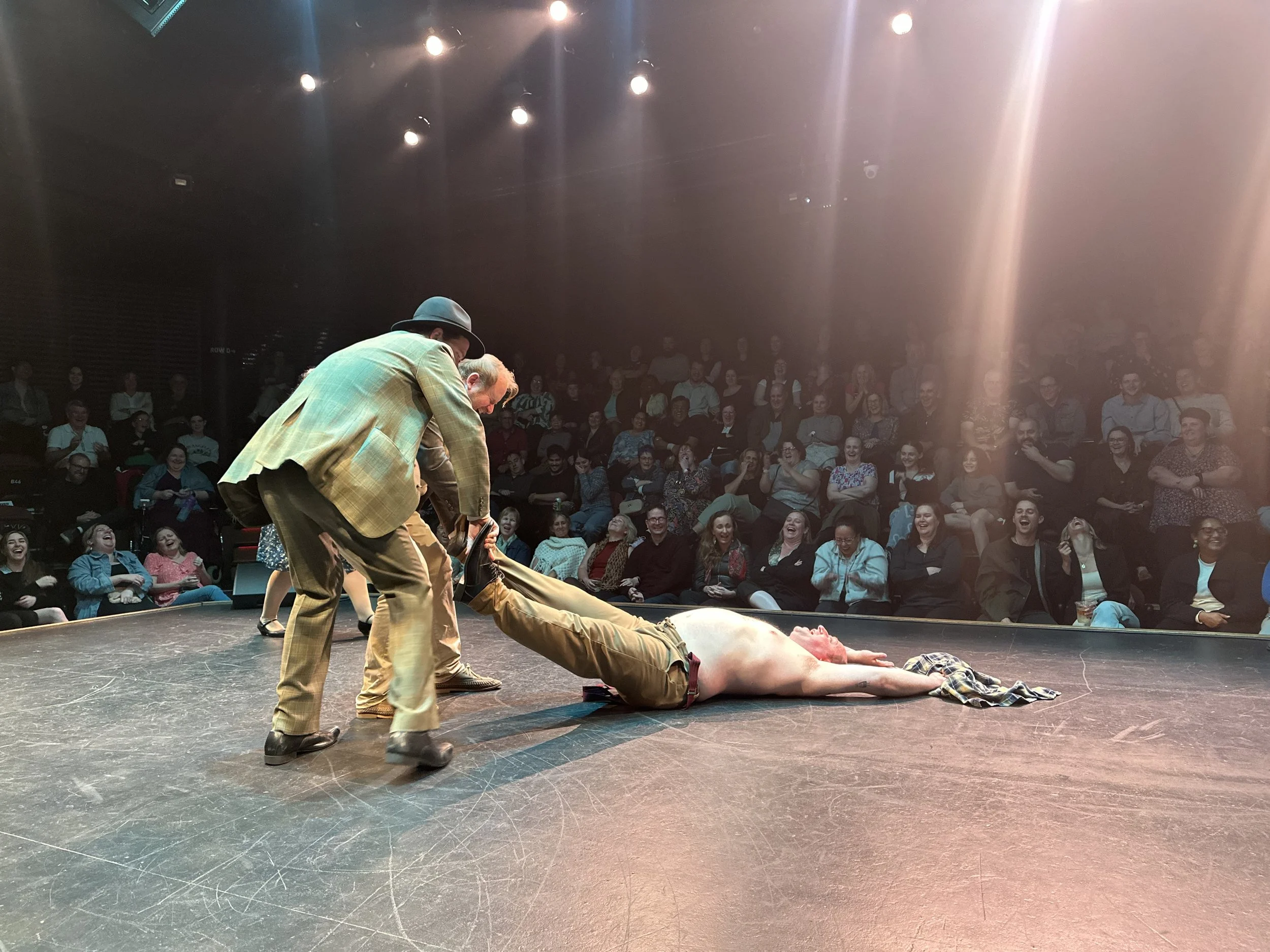 During our 2024 Brisbane Comedy Festival run, beekeeper Pierce Pollen (Jason Geary) was dragged off stage by Detective Inspector Owen Gullet (David Massingham) and Dr St-John Younghusband (Wade Robinson) as he attempts to protest the Annual Murder Village Wild Goose Chase. Natually, he scrawled “No Goose Chase” across his chest to really emphasise his point. Photo by Kris Anderson.